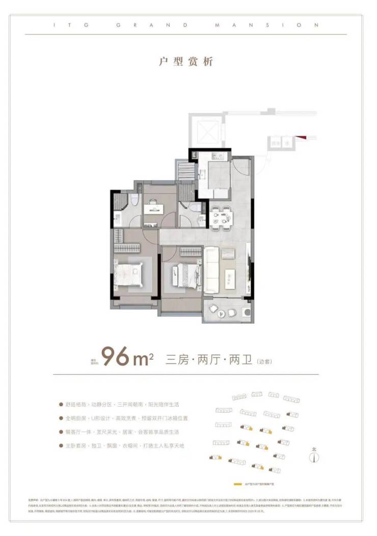 85–96㎡精装三房(主力):南北通透,得房率82%–85%,无连廊,双卫设计,客厅开间≥3.9米,主卧带飘窗