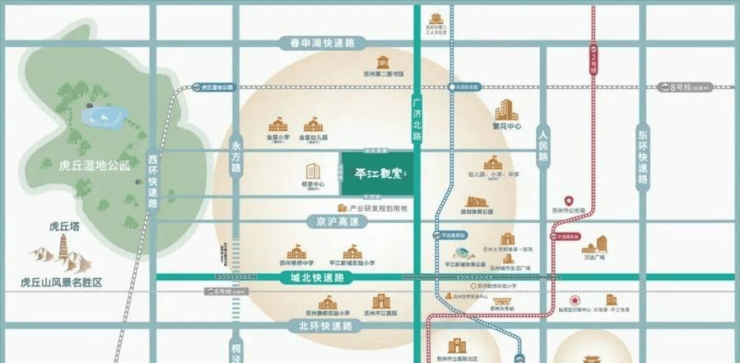 公园/文体:平江新城体育公园(约841米)、虎丘湿地公园、广济公园及苏州第二图书馆