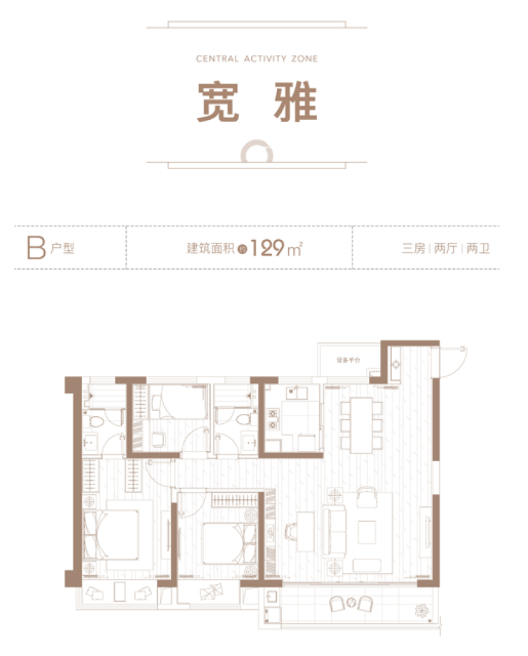 129㎡ 284 – 305 22,000 – 23,600 主力改善户型,双卫设计,家庭成长型首选