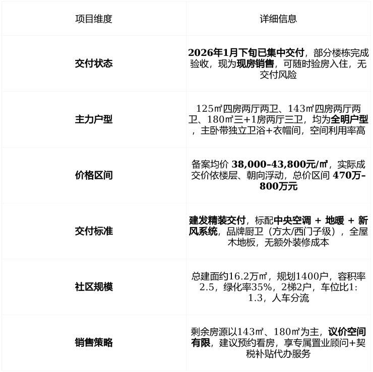 在售状态 : 现房交付中 ,2026年1月下旬集中交房,剩余主力户型为 125㎡、143㎡、180㎡四房 ,备案均价 38,000–43,800元/㎡ ,总价 470万–800万元 。