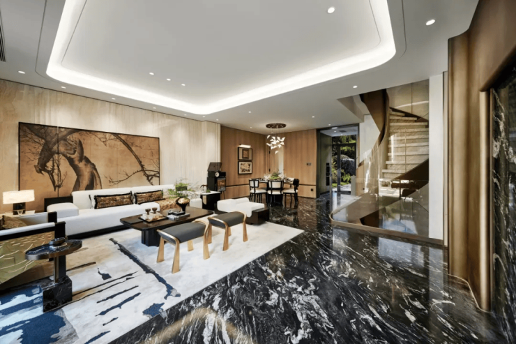 外立面采用宝格丽酒店同款进口维纳多奢石 + 超白玻幕墙设计,光影流动间尽显东方雅韵。社区入口打造宋风美学馆,满月景墙、凯撒灰景墙、叠石水景、仪式廊桥等多重场景,营造酒店式归家礼序,沉浸式感受东方诗意山水意境