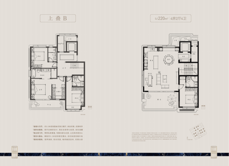 全屋四室及以上+主卧套房+独立衣帽间,动静分区极致清晰。