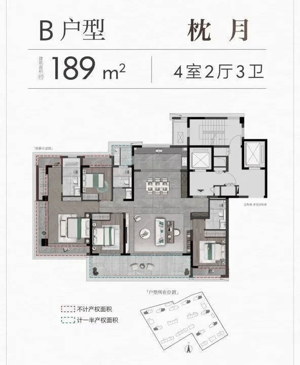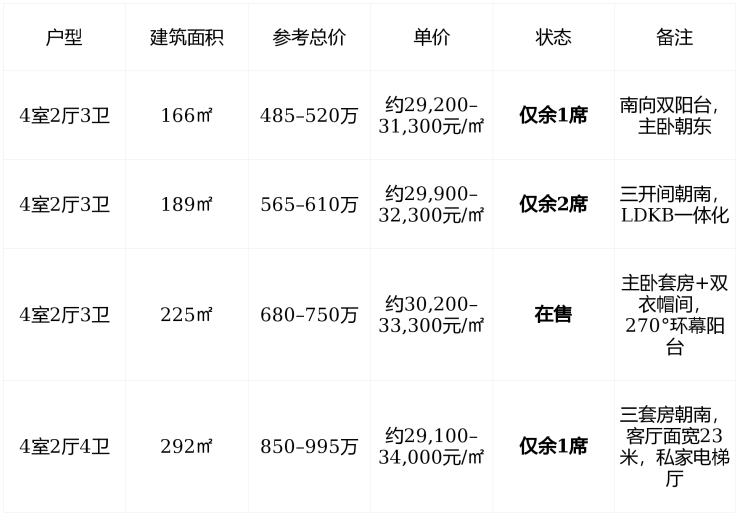纯大平层社区 :533户全为166㎡–292㎡四居以上户型, 无小户型干扰 ,圈层纯粹,邻里皆为改善型家庭;