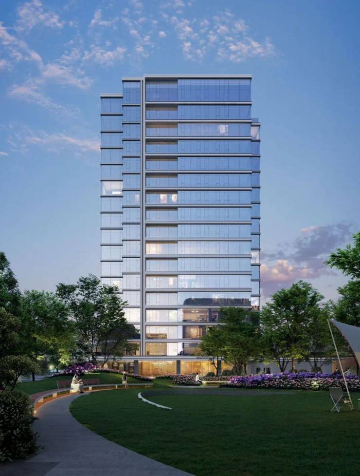 整个园区以围合式布局展开,七幢建筑借鉴中国古典园林的精髓,最大楼间距达到了63米,使得每栋楼都能享受到270°的开阔视野,仿佛是一座座隐匿于花园中的岛屿。为了与景观相呼应,园区立面采用“水晶天幕”设计,线条纤细,使建筑宛如天空中垂下的纯净湖面。