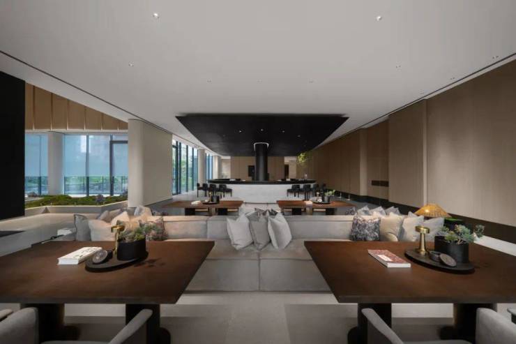 入园廊道天花板设计了星空顶,走道旁设有艺术装饰;往里走则是内庭水景区,让人仿佛踏进了喧闹城市中一方华丽又静谧的秘境,暖色灯光、林下休闲区,散发着慵懒的度假感。三进便是「艺术会所大堂」,请的是著名设计师吴滨。