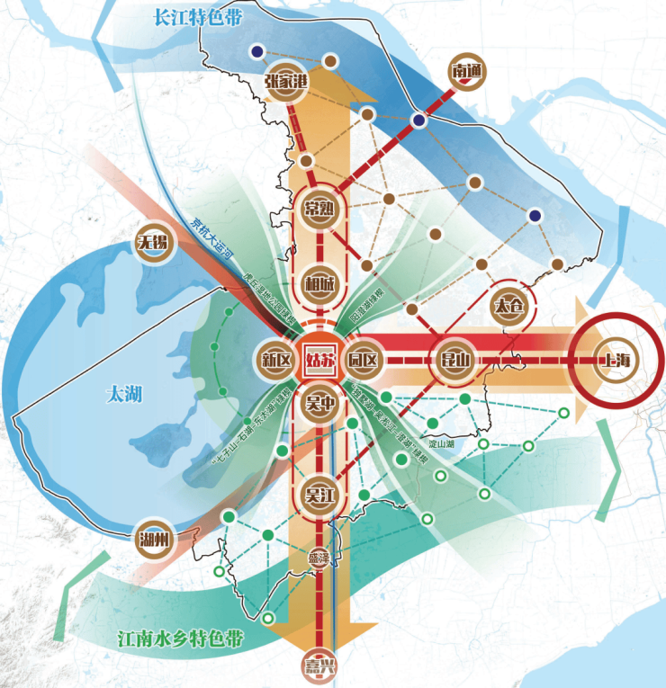 纵观苏州过去20年的发展脉络,其主要依托东西向的沪宁发展轴为城市主动脉发展;然而,随着城市的发展,东西向的沪宁发展轴已经处于饱和状态,苏州目前的发展重点正在向南北向的通苏嘉甬发展轴拓展,以寻求新的发展空间。
