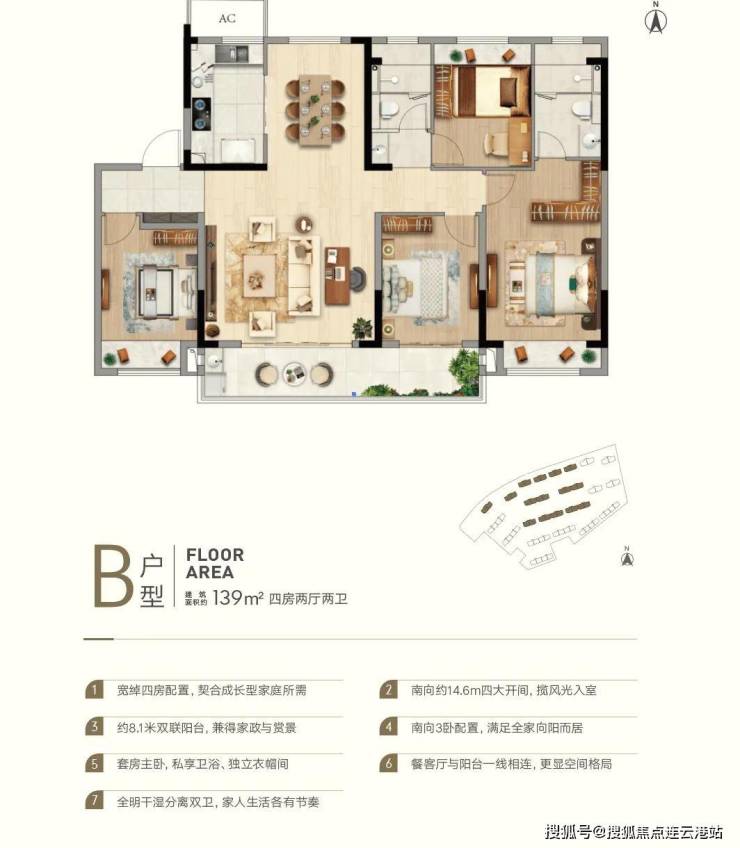 面积户型:125m²、139m²都是四房两卫户型。