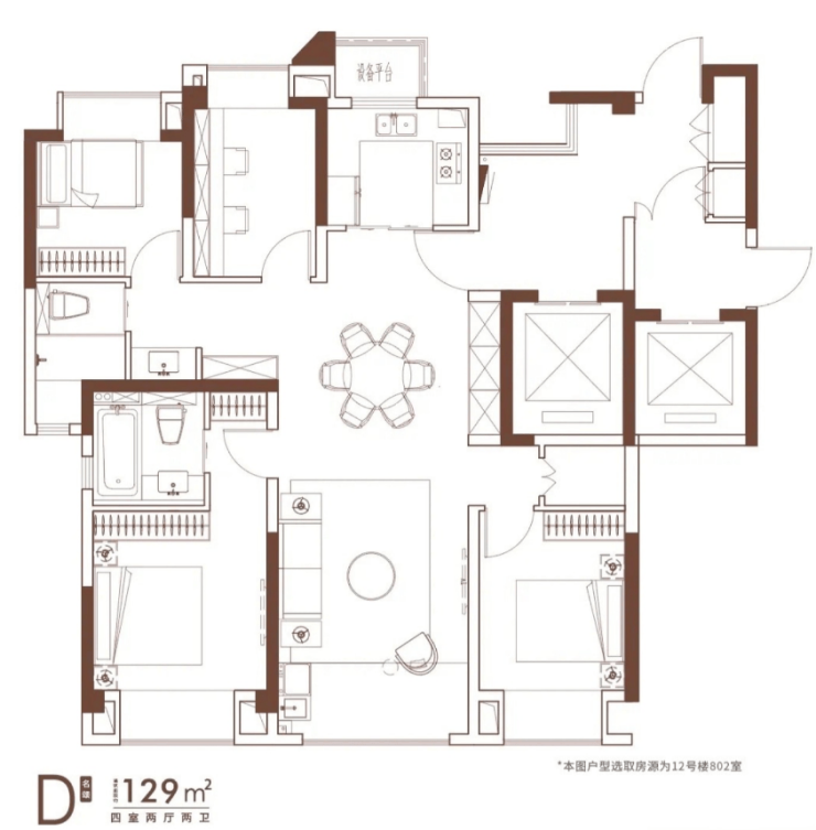 129㎡ 四室两厅两卫:南向布局,LDK一体化横厅,得房率约77%,适合三代同堂