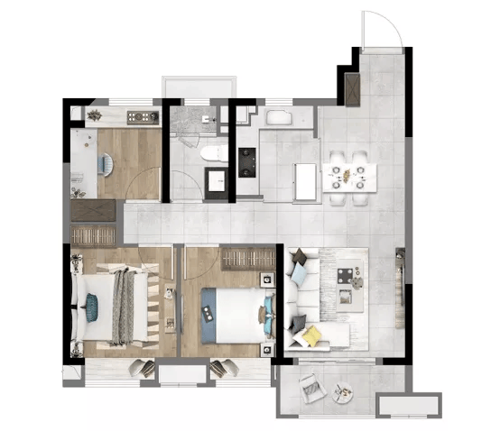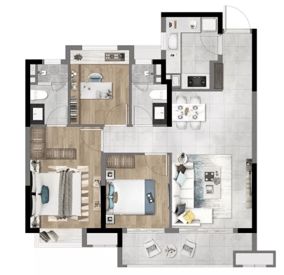 约99㎡三房两厅两卫设计,其中三开间朝南的大面宽是一大亮点。百平米不到的小户型,客厅及主卧均有大面宽设计,这是市面上同类户型难得一见的。