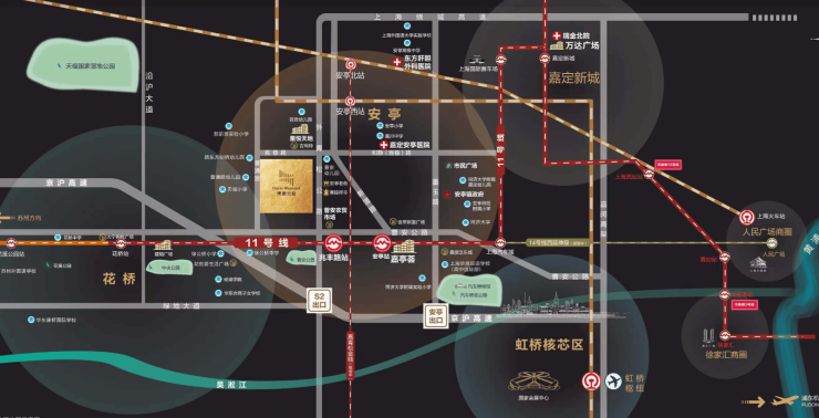 三轨交汇,通勤高效 :步行约 50米 直达上海地铁11号线“花桥博览中心站”,3站到嘉定新城,30分钟内可达徐家汇、迪士尼等核心商圈;未来可无缝换乘苏州S1号线、规划中的上海14号线西延伸段,形成三轨交汇格局,真正实现“工作在上海,居住在花桥”。