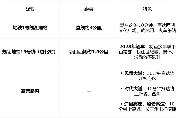 不依赖地铁通勤,但地铁是未来增值的锚点 。自驾是当前主力,未来地铁+高速双网联动, 通勤半径覆盖杭州主要就业圈 。
