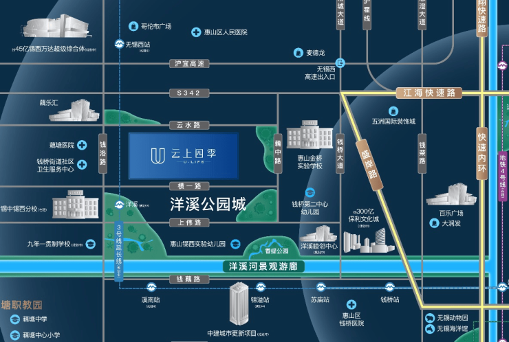 幼儿园至中学:3公里内汇聚7所幼儿园、3所小学(如钱桥小学)、4所中学(含省锡中锡西分校),形成“幼儿园-小学-初中-高中”完整教育链;