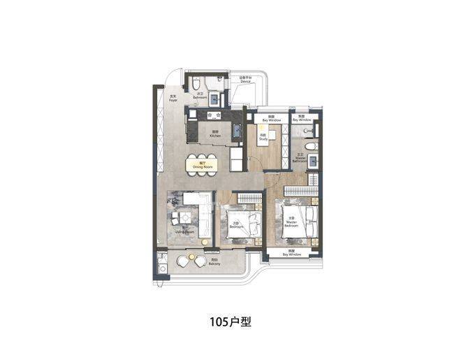 105㎡三房:采用动静分离设计,南向阳台加宽至1.8米,次卧连通阳台形成“阳光房”;厨房采用U型动线,操作台面长达3.2米;卫生间干湿分离,配备科勒智能马桶。