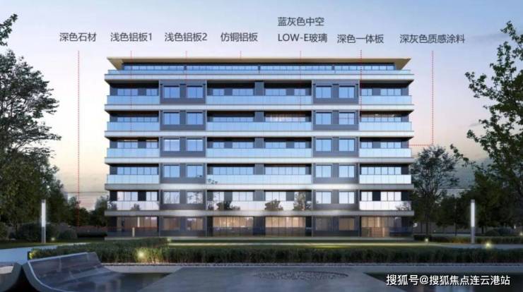 从效果图来看,项目外立面采用大面积玻璃、浅色铝板、仿铜铝板、LOW-E玻璃、深色石材组成,外立面颜值高,有质感,力求为居住者带来更富愉悦且健康安全的居住体验。