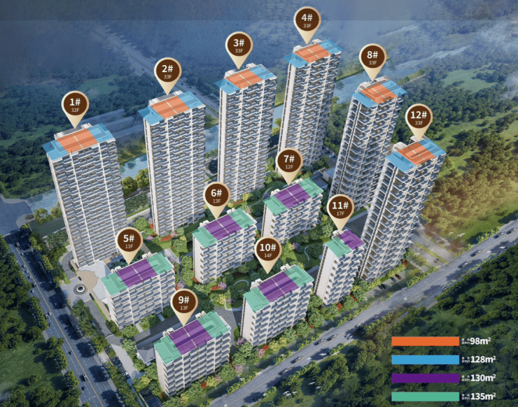 12栋四代住宅,包括6幢32-33F高层,6幢12-17F小高层