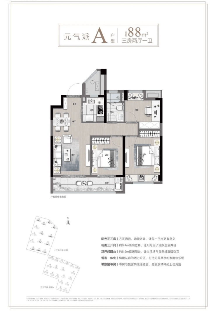 户型:主力户型为88-128平方米的三至四房,得房率高达84%-87%,在同类型刚需产品中处于领先水平。