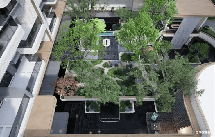 40%绿化率社区:内部景观以“水漾·森海”为主题,设计“一环、两轴、两园、九院”体系,融合森林静谧与海洋灵动,打造四季有景的沉浸式园林。