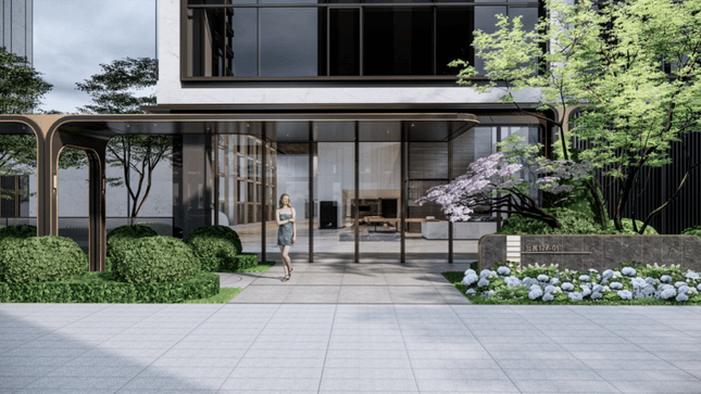 归家仪式:创新廊桥式归家动线,结合镜面水系、景墙、植被,打造“安曼酒店风”入户体验。