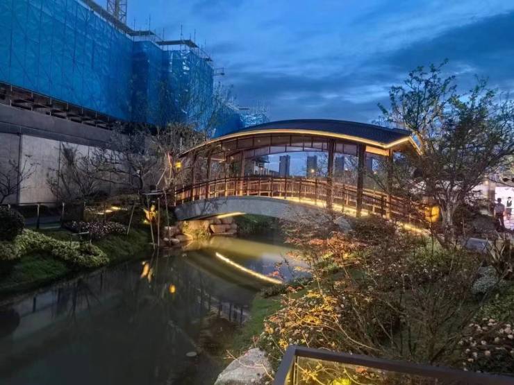 “三进归家·五园九景”新中式园林:一进威仪门庭、二进芙蓉碧池、三进石庭树院,水系贯穿,四季有景。