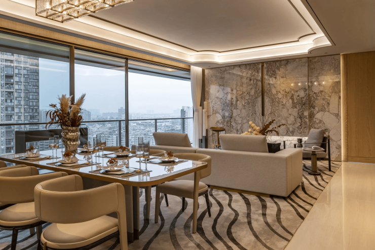 外立面采用宝格丽酒店同款进口维纳多奢石 + 超白玻幕墙设计,光影流动间尽显东方雅韵。社区入口打造宋风美学馆,满月景墙、凯撒灰景墙、叠石水景、仪式廊桥等多重场景,营造酒店式归家礼序,沉浸式感受东方诗意山水意境