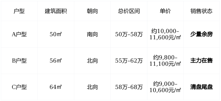 价格趋势 :2025年11月均价1.1万/㎡,2026年1月微调至1万/㎡左右,部分房源总价低至50万起,为近年最低点。