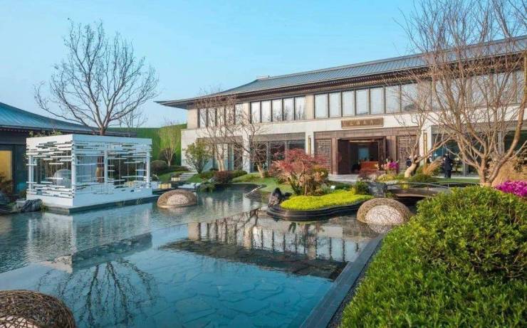 项目打造约4万方新中式园林,仿照江南名园寄畅园设计,包含梯田叠水、中央草坪等景观