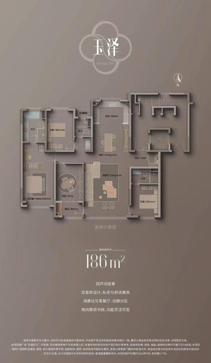 主力户型为建面163-251㎡精装大平层,得房率81%-83%