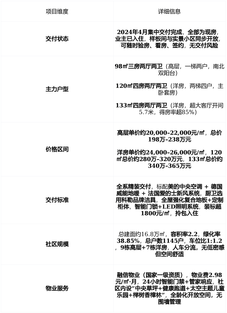 在售状态2024年4月已全面交付,现房发售无期房风险,即买即住 ,主力产品为 98㎡三房高层120–133㎡四房洋房备案均价20,000–26,000元/㎡总价198万–365万元精装交付,实景可验