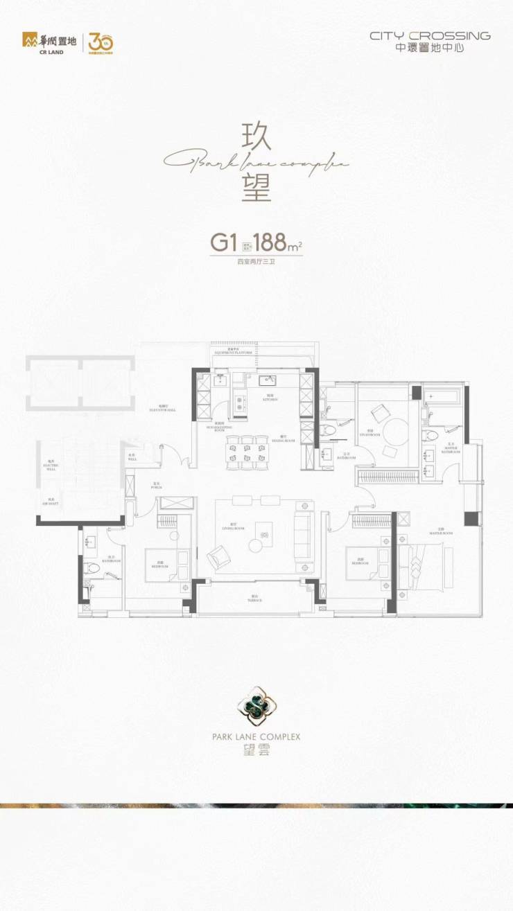 188㎡四房:四房三卫,独立入户玄关,主卧套房+双卫+双阳台,类一梯一户设计,私享电梯厅;
