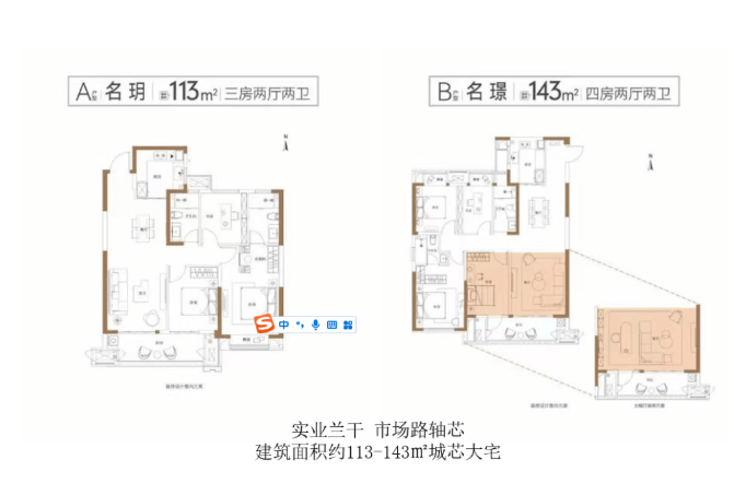 【面积】113平3房2卫,143平4房2卫