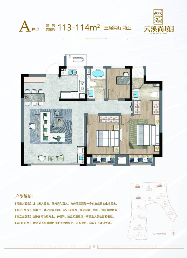 建面 114㎡3 居,总价 150.0 - 170.0 万,分布于 12#、10#、9# ,1 梯 1 户,尊享私密空间。层高 3.15 米,总楼层 13F,开阔明亮,满足一家三口或二胎家庭的居住需求