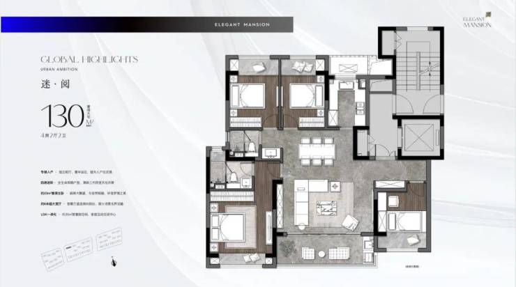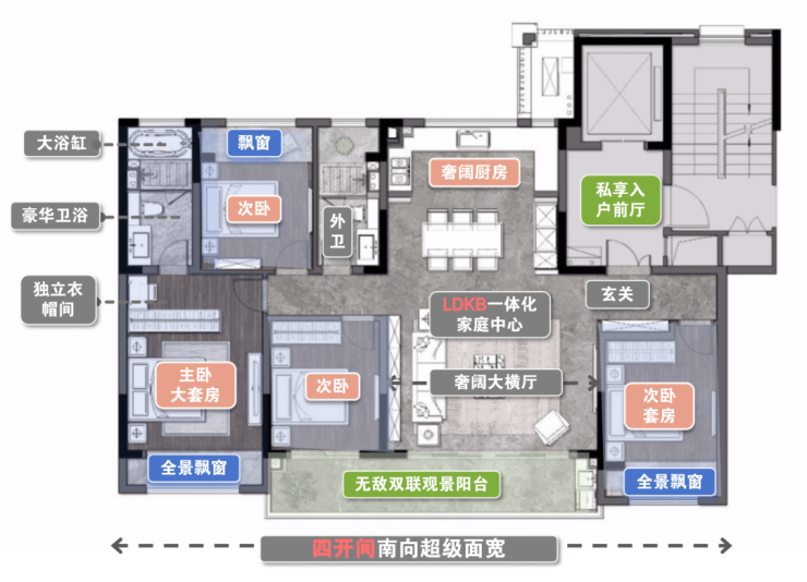 【户型亮点】私家电梯入户+独立入户玄关,私密性强。约5.6米的横厅+面宽约8.6观景阳台,采光、通风性能佳。双套房设计,让改善更彻底。