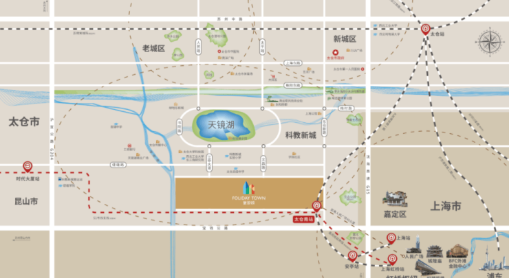 紧邻太仓南站(约500米),1站直达上海虹桥,30min可达上海静安,实现“沪太同城”生活。