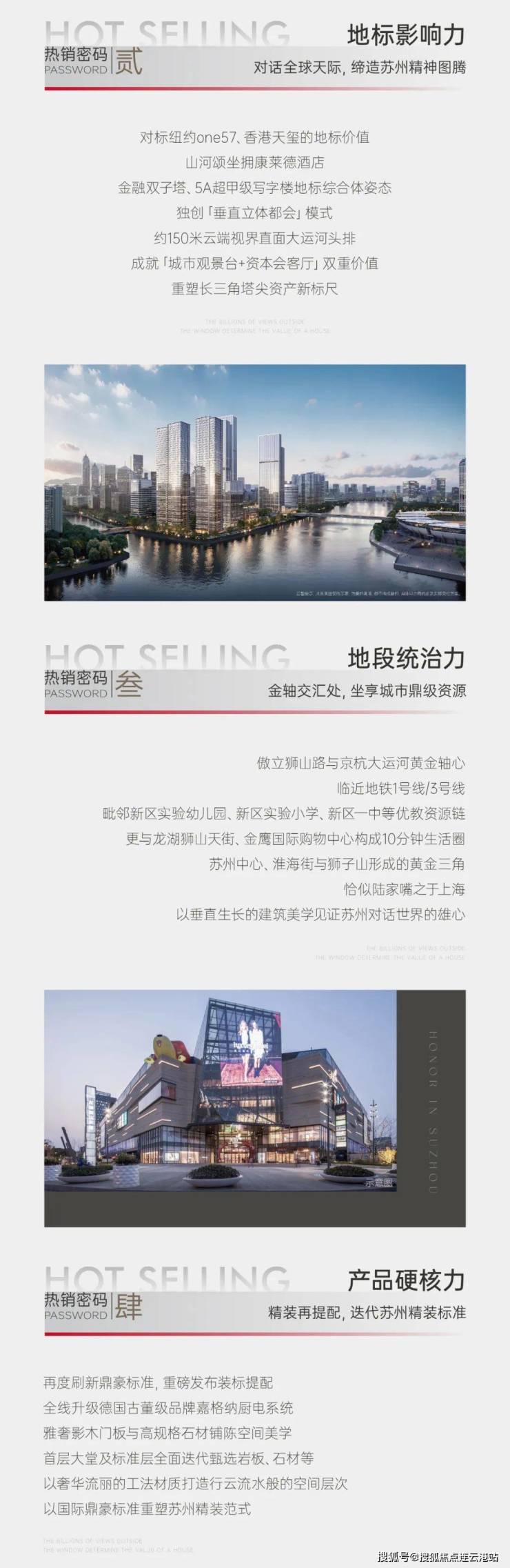 【项目核心价值点】狮山路核心CBD·最极致资源配套主城稀缺土地·终极置业地段运河文脉传承·绝版沿线住宅隐贵定制豪宅·极致稀缺平墅传奇综合地标·纵享国际生活国际巅峰大宅·纯粹公建立面豪宅龙湖品牌·深耕苏州11载国际一线臻装·隐奢细节雕琢亿级隐奢会所·康莱德行政酒廊钻石龙湖物业·康莱德增值服务