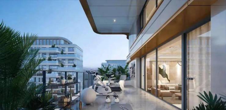 "一方云端庭院,让院落情结与现代技艺完美融合——约15-35㎡太湖空中院落,270°环幕揽湖光,6米挑高引清风,既是瑜伽观星的诗意栖居,亦是烧烤派对的社交主场,重构峯层生活的精神容器。"