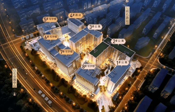 总建筑面积约28万㎡,含4栋总部办公、3栋酒店式公寓及商业裙楼,容积率3.5,绿化率30%