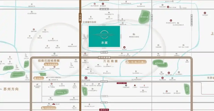 主干道通达:紧邻昆山“黄金中轴”长江路与中环快速路,自驾10min可达万达广场,30min通达苏州园区与上海虹桥
