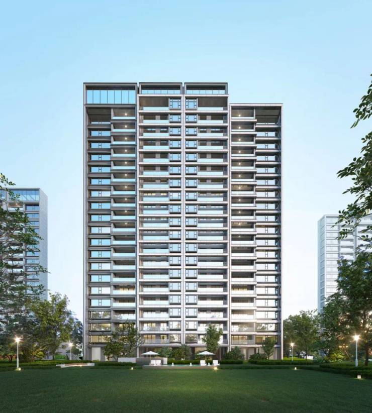 外立面采用陶瓷保温一体板+铝板,窗墙比高,呈现极简镜面美学。