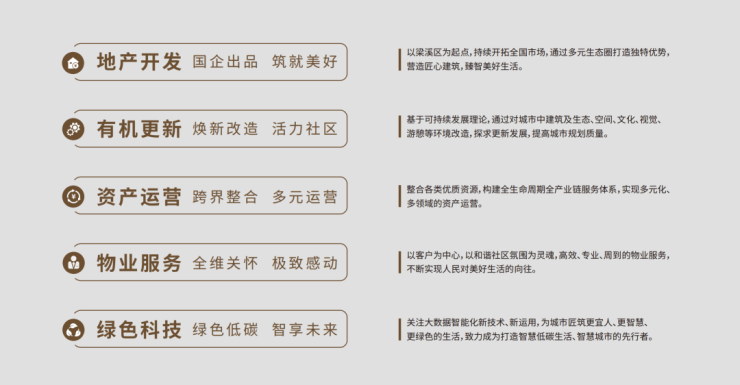 梁城美景,是梁溪城发集团全资控股子公司,成立于2023年2月,迄今已落23子。以低碳智慧城市运营商为定位,发挥千亿国企平台优势,立足地产开发、有机更新、绿色科技、物业服务、资产运营五大领域,不断促进区域空间优化,提升梁溪城市影响力,助力城市升级。
