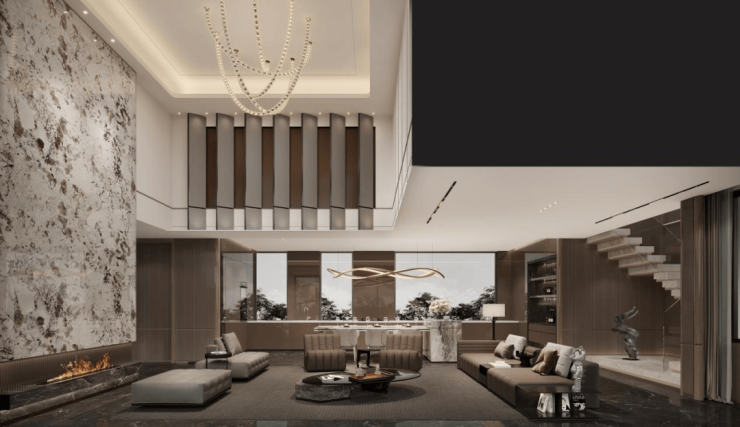而建筑面积约205-285㎡独层环墅,则赋予更大的空间尺度感。三层两户,最大户型单层可达8面宽,约3.3米层高,部分旗舰户型采用三套房设计,标配270°全景看台、行政级主卧专属层,匹配更高阶的居住享受。