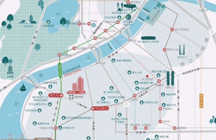 跨江通道密集:周边有钱塘江大桥、复兴大桥、西兴大桥、之江大桥及望江、庆春、博奥三条隧道,快速通达钱塘江两岸