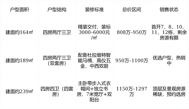 产品定位 :专为改善型家庭打造的 纯大平层社区 ,无小户型干扰,容积率2.35,总户数仅385户,低密高质,私密性强。
