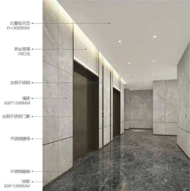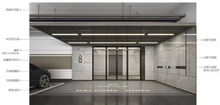 除此之外,此次品质升级还重点关注了地上、地下双大堂的质感提升,在整体风格上采用现代与轻奢结合的方式,用大面积几何铺装和金属装饰线条来表现,以大气高级的时尚品位做视觉向导,增添空间纵深感的同时,赋予奢居生活更高品质的定义。