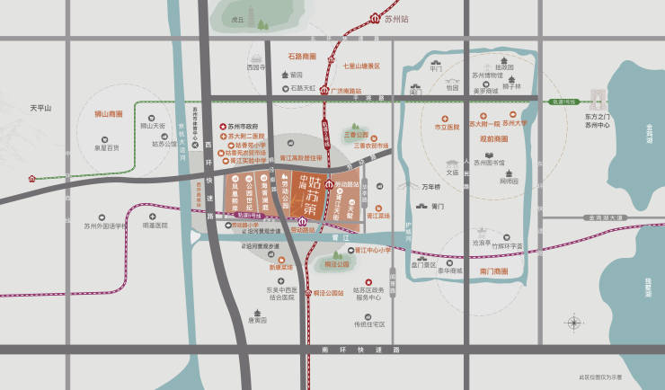 路网 :紧邻 劳动路、桐泾南路、西环高架、南环高架、干将西路、人民路 六大主干道,形成“两轨六轴”立体路网,通勤效率为姑苏区最高评级(CIA交通指数5级)