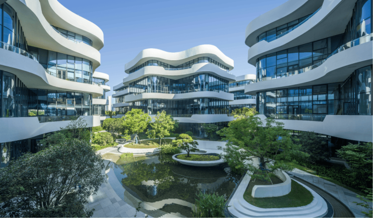 垂直绿化立面+无车流步道,实现“办公在花园,生活在公园”