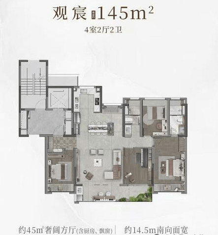 标准层户型:4房2厅2卫设计,南向开间14.4米,双开间阳台,主卧套房带独立卫浴,全屋多飘窗设计