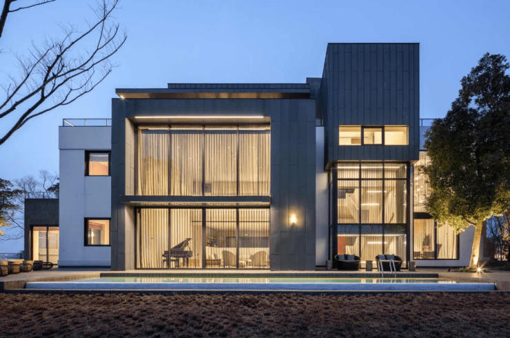 建筑采用青砖、船板木、火山石等天然材料,外立面融合东方美学与现代工艺,部分户型面宽达16.3米,打造“天人合一”的居住哲学 。