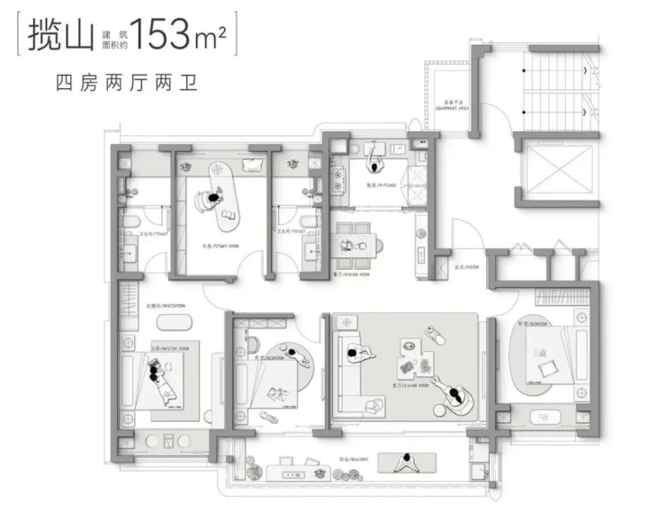 153㎡:4房2厅2卫,全卧室朝南,大横厅+双联阳台,总价约638-796万。