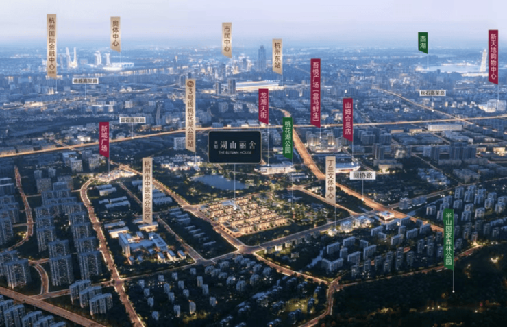 项目一墙之隔即为约300亩的 桃花湖公园,实现“推窗见湖、出门入园”,生态兑现度100%,为竞品中唯一真正一线临湖项目 。周边还有半山国家森林公园、皋亭山等“翡翠项链”环抱,宜居指数高 。