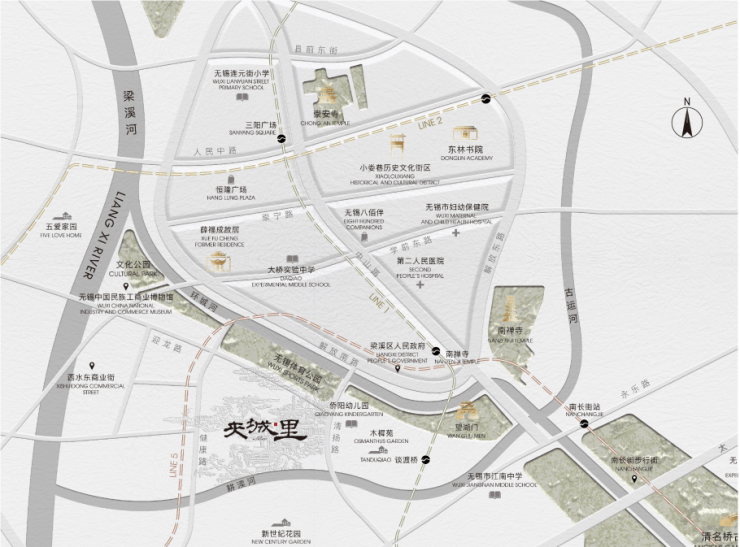 项目地处无锡文化轴线核心,与淘沙巷古运河商脉、崇安寺千年皇寺、钱钟书故居学术文脉、薛福成故居江南园林可谓“零距离”,仿佛置身于贯穿古今的文化长廊。